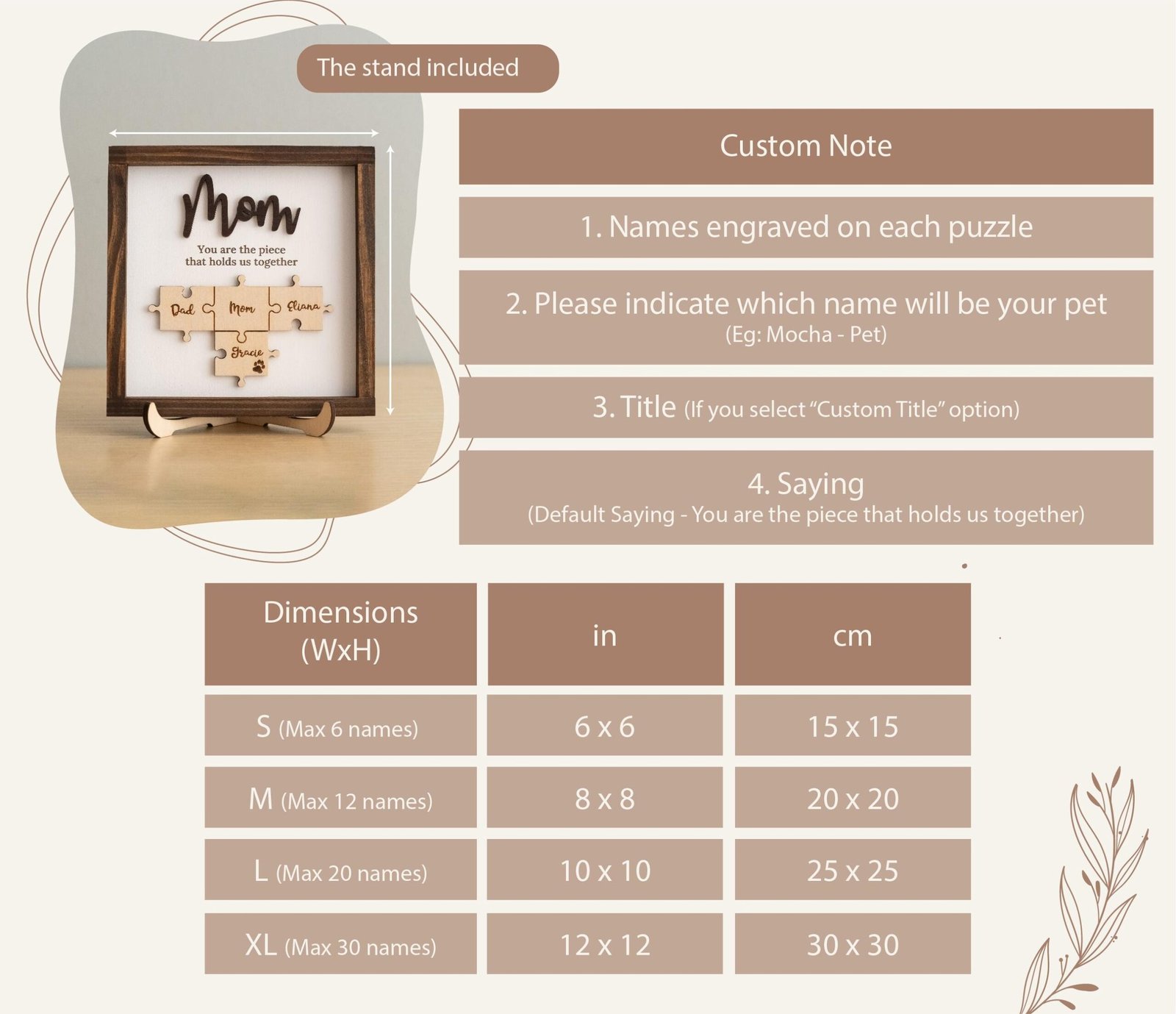 “Mom, you are the piece that holds us together” – This sentiment is showcased on this beautiful custom-made sign. Whether you are gifting for a birthday, Mother’s Day, Christmas, or just because—this handcrafted sign/shelf sitter is sure to be well received by the matriarch in your life. With an intricate black frame, welded onto an elegant scripted “Mom”—the details set this piece apart. Beneath the “Mom” is the phrase “You are the piece that holds us together” engraved onto our faux shiplap backing. Toward the bottom of the sign, the custom engraved puzzle pieces make this gift all the more meaningful. We can include up to 16 puzzle pieces onto the sign. The sign comes with a stand for displaying.