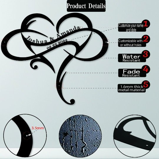Add a personal touch to your home decor with our exquisite Personalized Metal Infinity Heart Sign. This elegant wall decor piece features an infinity symbol interwoven with a heart shape, making it a perfect representation of everlasting love and warmth. Customizable and Versatile: Express your creativity by customizing this metal sign with names, initials, or a special message of your choice. Whether it’s for your family, a loved one, or a friend, this thoughtful and unique gift is perfect for any occasion—be it Christmas, Valentine’s Day, Mother’s Day, housewarming, or a milestone anniversary.